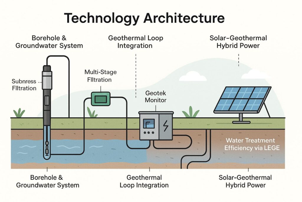 At Geotek Water Solutions, we are pioneering a new model of sustainable water infrastructure: integrating water access and clean energy into one system. Our innovation uses a single ground water wells (boreholes) not only to extract groundwater, but also to harness low-enthalpy geothermal energy (LEGE)—providing reliable water treatment powered by renewable thermal energy. This approach is designed to address the dual challenges of energy cost and water quality in off-grid, agricultural, and industrial settings.